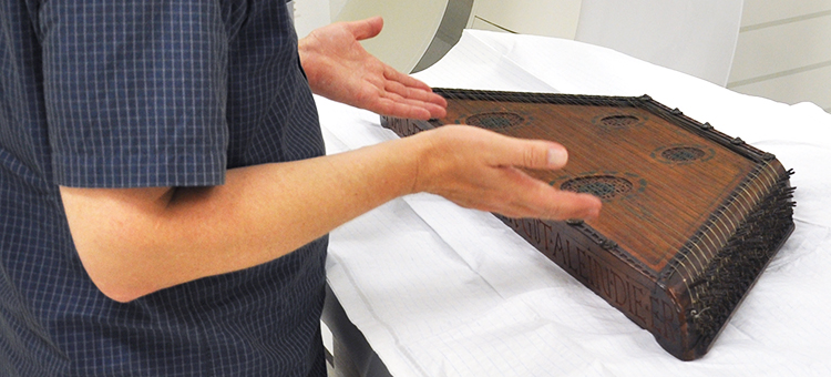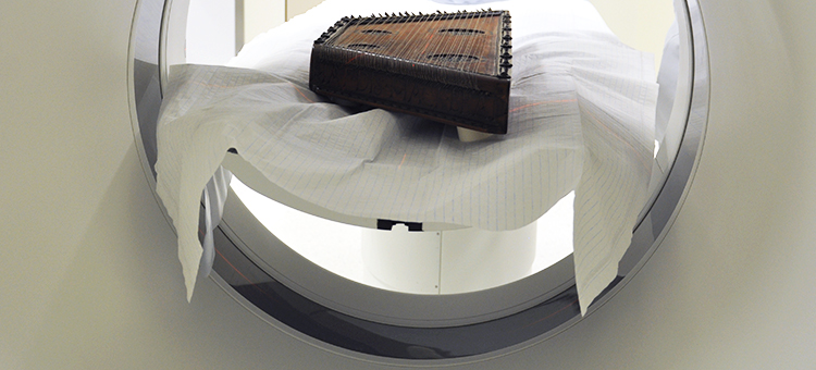PD Dr. Martin Kirnbauer, Leiter des Museums für Musik in Basel und Kurator für die Sammlung alter Musikinstrumente des Historischen Museums Basel, nahm vor einem Jahr bereits Kontakt auf mit uns, weil er das Innenleben einer alten Violine erkunden wollte. Im August 2016 hatte er nun das älteste Hackbrett der Schweiz im Gepäck. Er hoffte, dank der Bildgebung des CT mehr Informationen über die Bauweise des Instruments erfahren zu können.