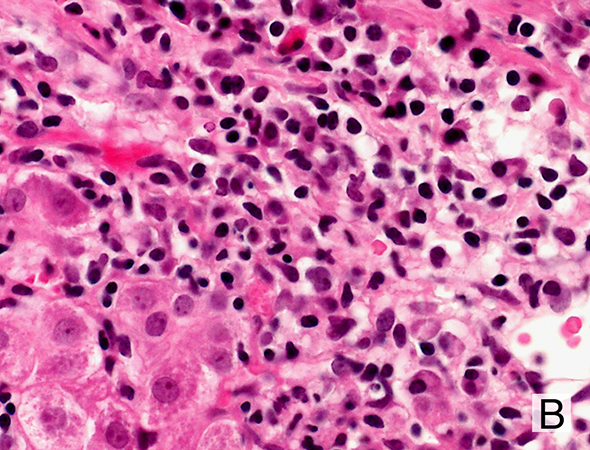 Interphasen-Hepatitis: Beachte Reichtum an Plasmazellen.